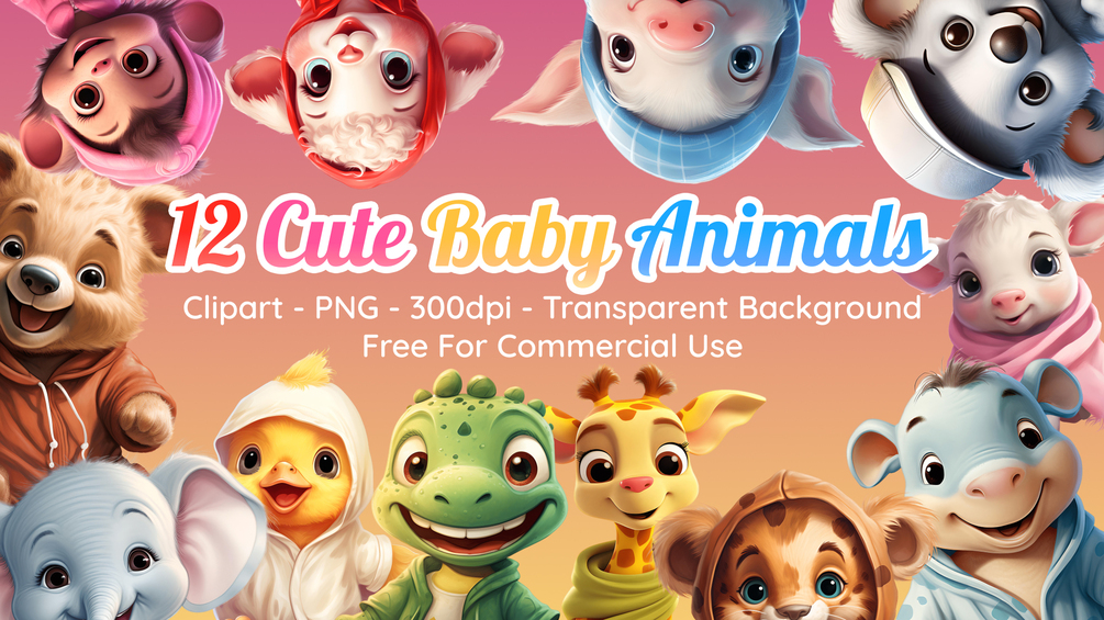 Introducing adorable collection of 12 cartoon baby animal illustrations!